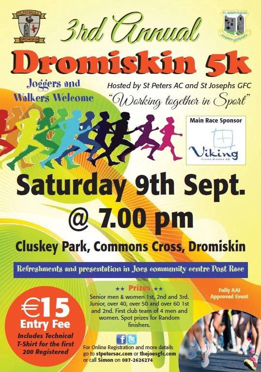 St Peter’s AC and St Joseph’s GFC have joined forces for the third annual Dromiskin 5k Race which will take place on Saturday, September 9th at 7pm.