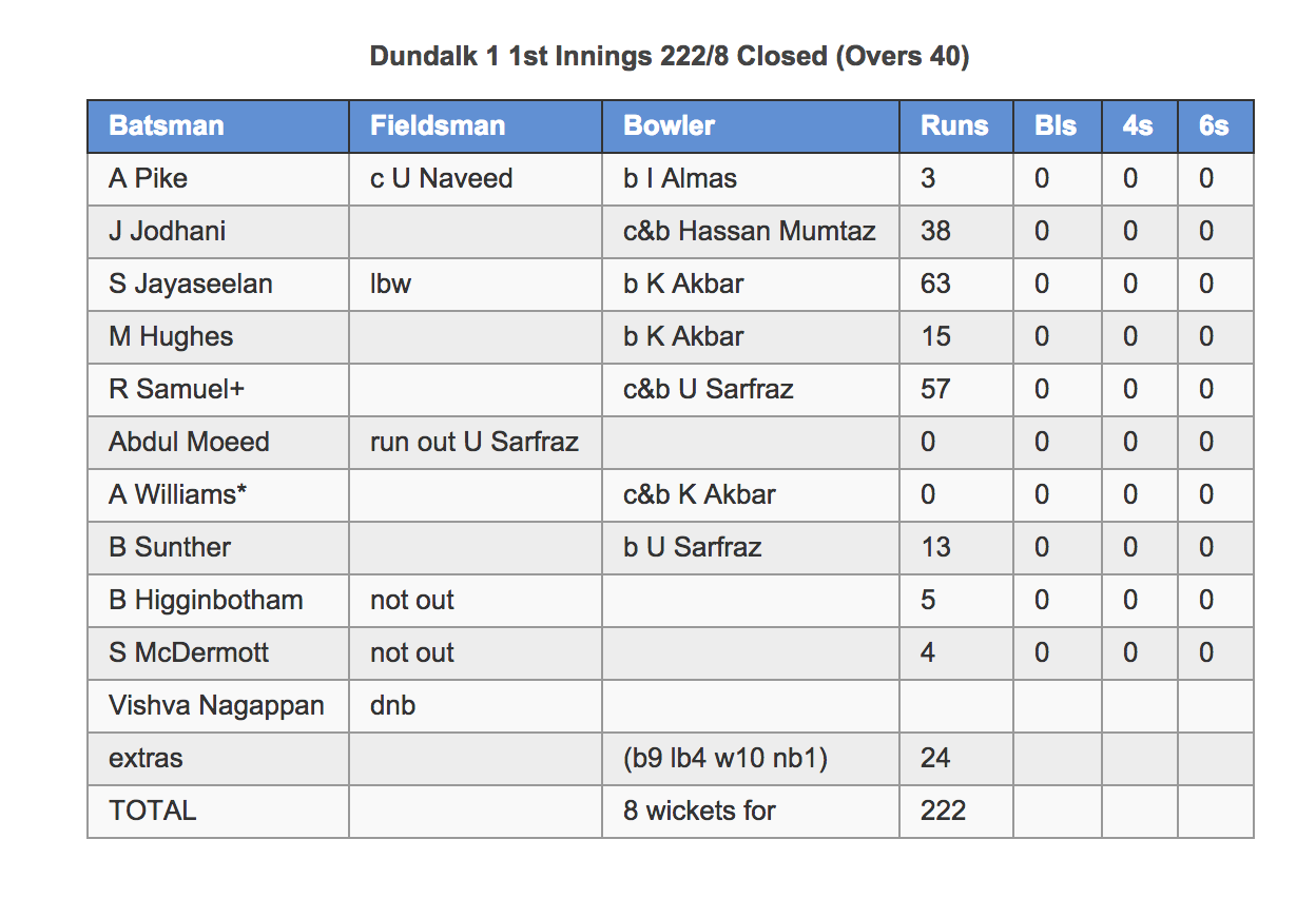 Longford batted first and for the first 25 of their 40 overs, they were held on a tight leash by the Dundalk bowlers, led by captain Andrew Williams and backed up by the swift Regin Samuel, the crafty swing of Andrew Pike and the youthful exuberance of Abdul Moeed.